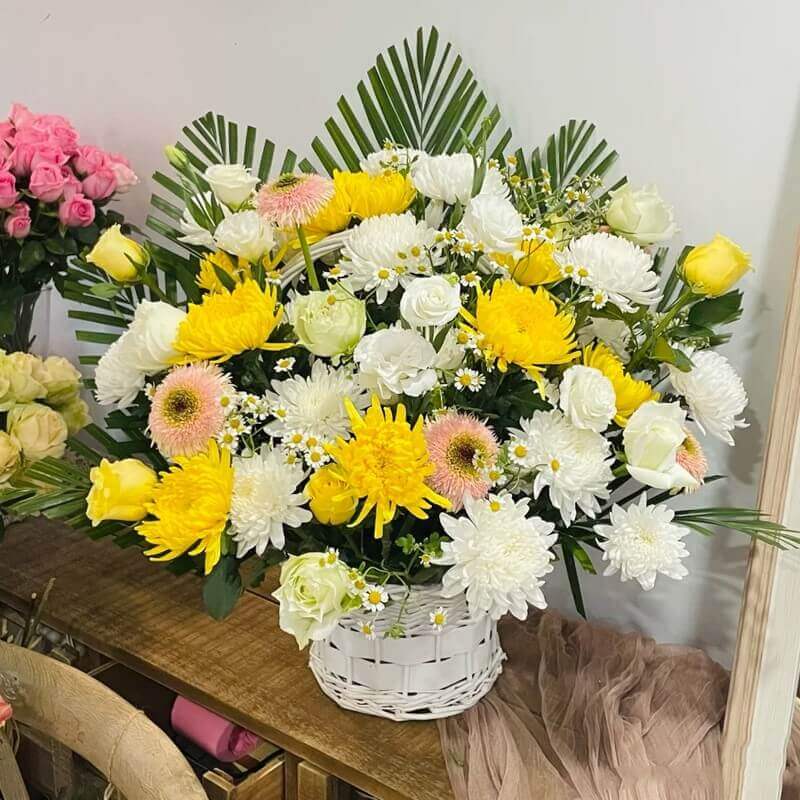 花材:白色菊花,黄色菊花,白色玫瑰,香槟玫瑰,其它绿叶搭配