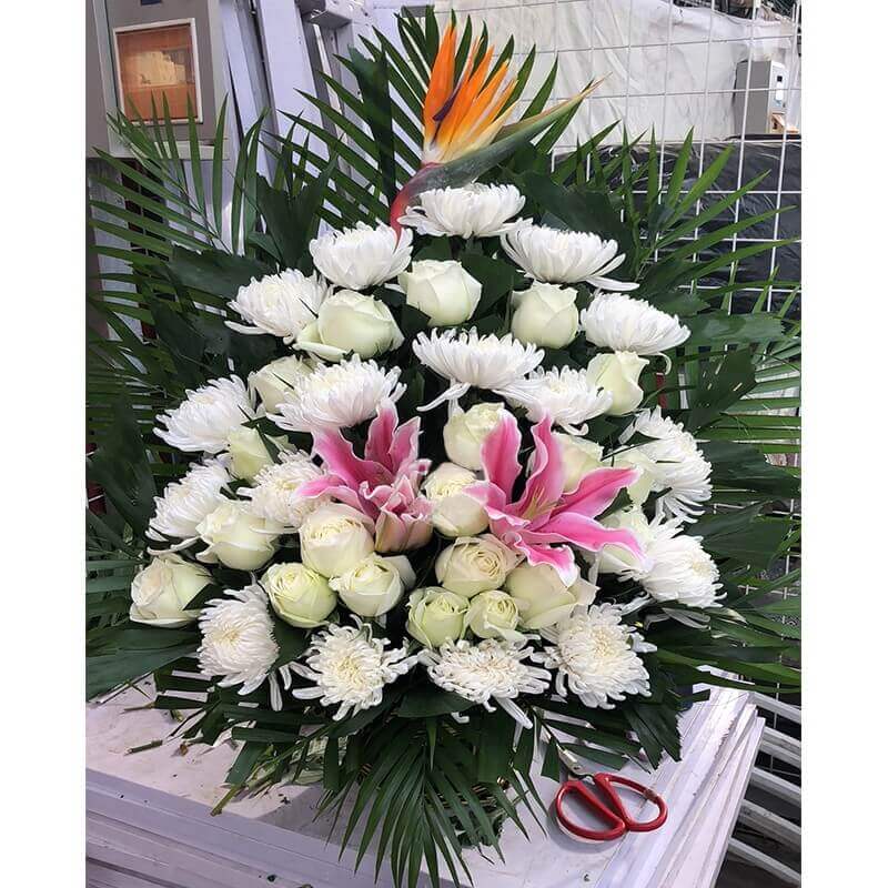 花材:白色菊花,白色玫瑰,粉色百合,其它绿叶搭配