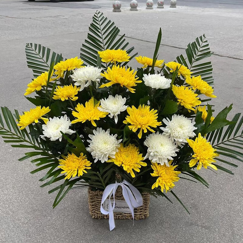 花材:白色菊花,黄色菊花,其它绿叶搭配